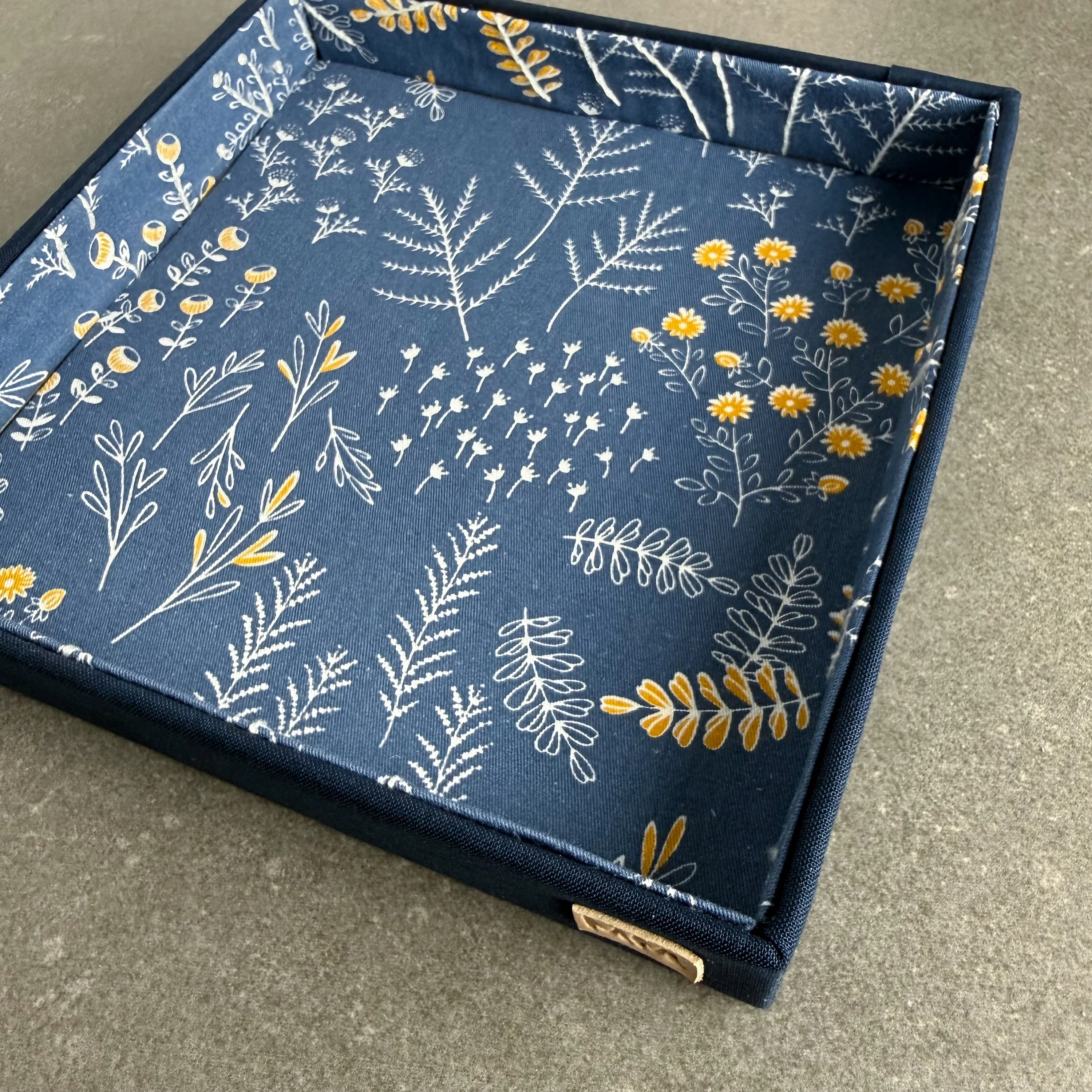 Midnight Garden - Valet Tray #0001, January 2026 Handcrafted valet tray made using traditional French cartonnage techniques. Navy cotton exterior with a botanical interior and embroidery details. +3 Cartonnage Embroidery
